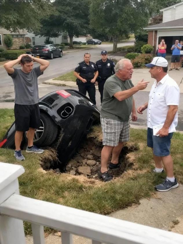 The ground collapsed instantly, swallowing the Lamborghini’s front end with a sound less like a collision and more like finality—carbon fiber meeting reality in a sharp, decisive punctuation that echoed down the street.