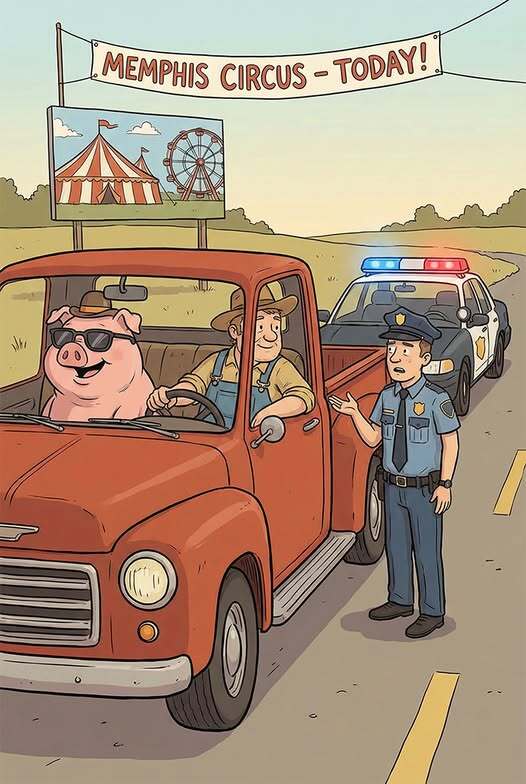 The cop said, “I’ll let you off the hook this time if you promise to take the pig to the zoo when you get to Memphis.”