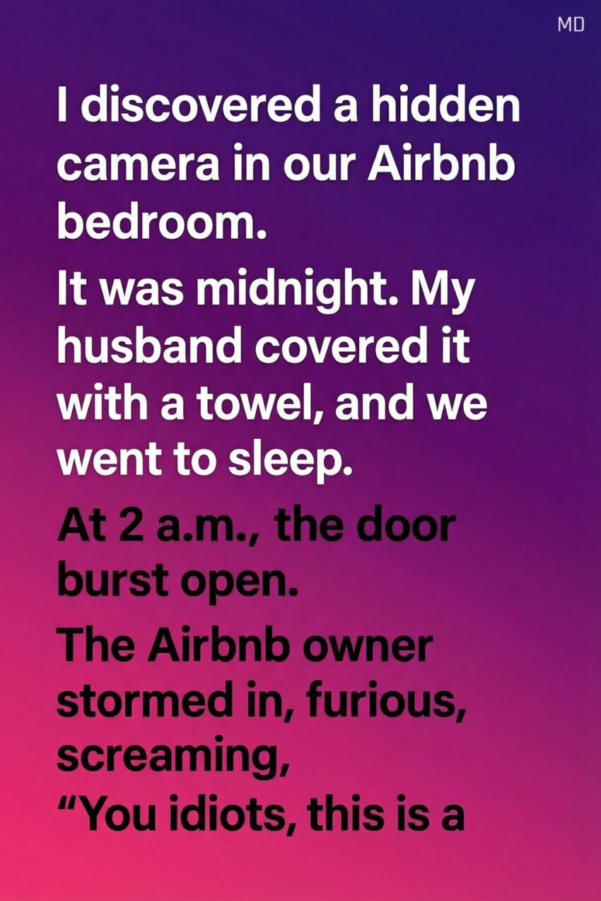 Our weekend trip was supposed to be a simple escape from busy schedules and endless responsibilities. My husband and I had booked a cozy Airbnb outside the city, hoping for quiet nights and long morning walks. The house looked perfect at first glance—clean, welcoming, and peaceful. But just as we were getting ready to sleep, I noticed a small device placed unusually high on a shelf in the bedroom, angled toward the bed. A closer look made my stomach drop. It looked like a hidden camera. Unsure what to do at midnight in an unfamiliar place, my husband covered it with a towel so we could think clearly in the morning.