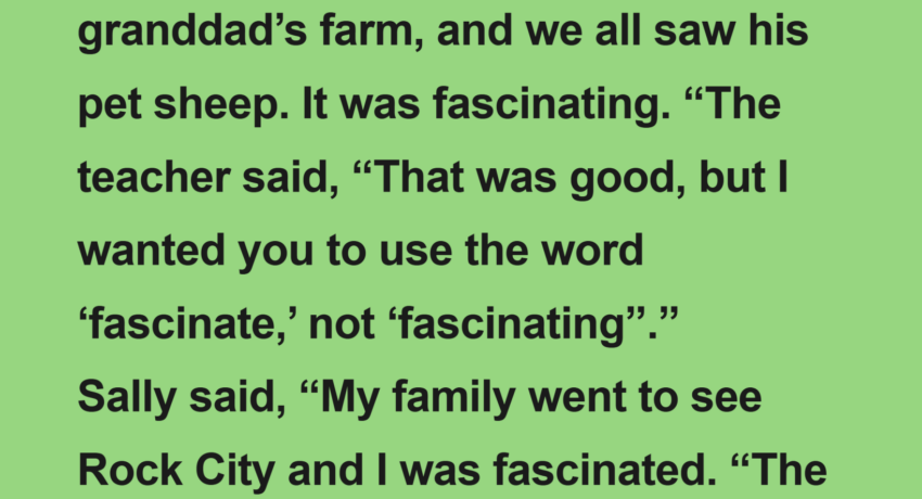 “My famly went to my granddad’s farm, and we all saw his pet sheep. It was fascinating. “The teacher said, “That was good, but I wanted you to use the word ‘fascinate,’ not ‘fascinating”.”